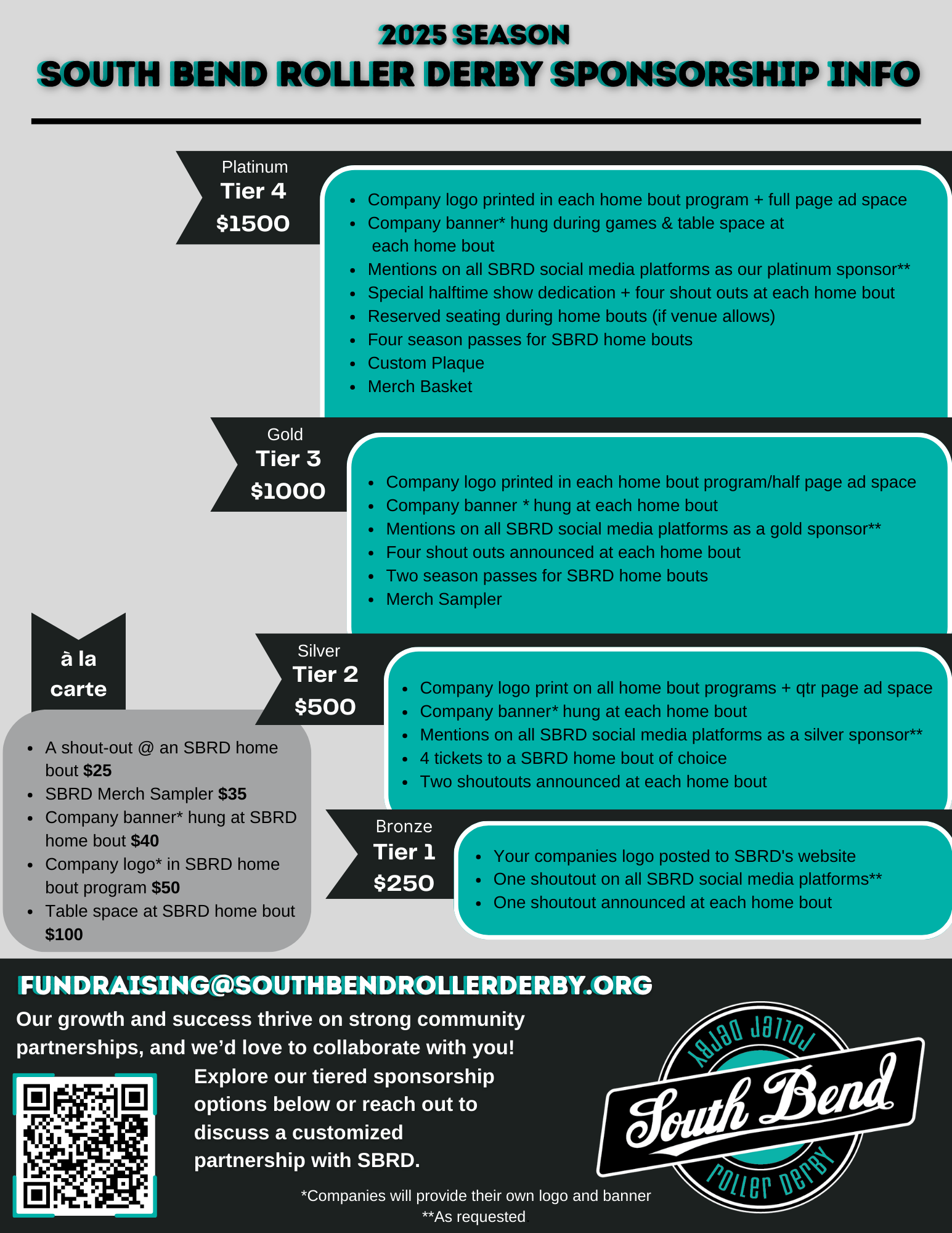 The South Bend Roller Girls have built a steadily-growing network of volunteers, personnel, and fans. Home bouts alone host crowds of more than 500 people. By partnering with our league, you can create a solid reputation among our home crowds and with our online following, as well.
